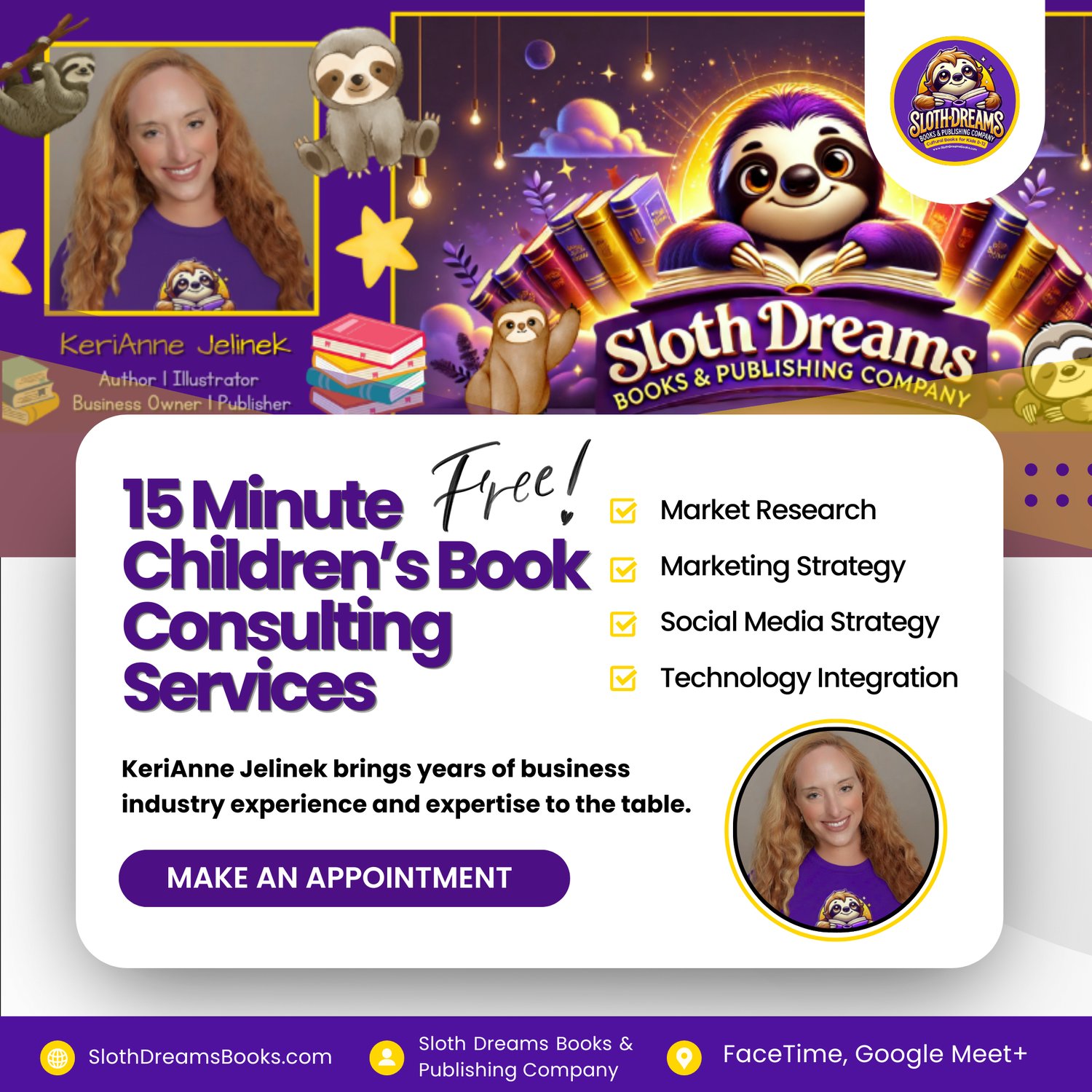 Book professional author consulting with KeriAnne N. Jelinek, expert book marketer, publisher, author, and illustrator. Choose from 15, 30, 60, or 120-minute strategy sessions designed to help indie and aspiring authors with publishing, branding, marketing, and book sales growth. Get personalized guidance, actionable plans, and expert insight to successfully launch, market, and scale your book.